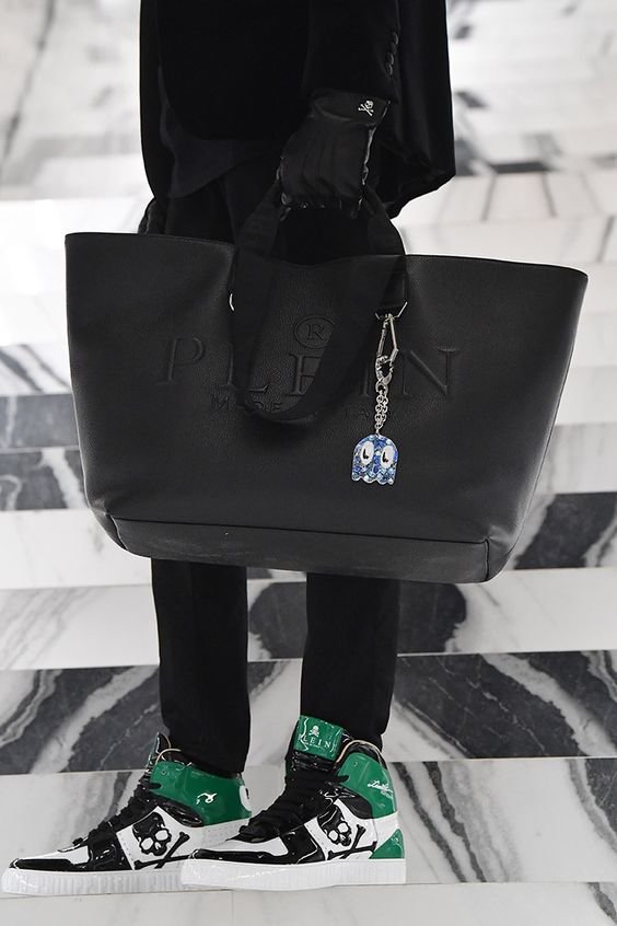 شنطة يد رجالية Philip Plein من الجلد الأسود تتميز بحجمها الكبير والعملي.
