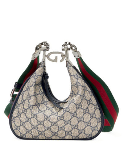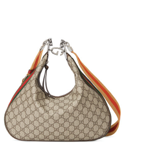 ويحافظ مونوغرام GG على قيمته للمواسم القادمة ويشكل عنصراً خالداً في خزانة الملابس، وقد سجّل خلال السنوات الأخيرة عودة لافتة. وبات المستهلكون يميلون نحو اقتناء قطع لا غنى عنها ومليئة بطبعات الشعارات وهي تزداد شعبيةً وطلباً. وتماشياً مع رموز العلامة التجارية، تمثل حقيبة Gucci Attache التي تم طرحها مؤخراً هوية العلامة التجارية بكل جوانبها. ويميّزها إبزيم على شكل حرف G، وهي مقلّمة بأسلوب شبكي، ما يعكس بشكل مثالي رموز الدار البارزة والرؤية الحديثة التي تعتمدها اليوم. فالتصميم المعاصر مستوحى من عنصر تاريخي في الأرشيف يعكس أسلوباً من حقبة السبعينات. وقد طُرحت بألوان أحادية بالإضافة إلى طبعة المونوغرام التي تظهر على تشكيلة من الأحجام المختلفة. وتضيف العناصر التفصيلية للمعدن المميز على شكل G الذي يفتح ويغلق، اللمسات الأخيرة على موديل نصف القمر.
