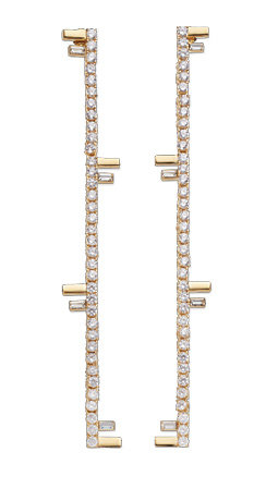 بأسلوب التنس الناعم مع لمسات ذهبية، تتزين أقراط Fendi المتدلية والبارزة التي تتضمن شعار العلامة بالكريستالات البيضاء.