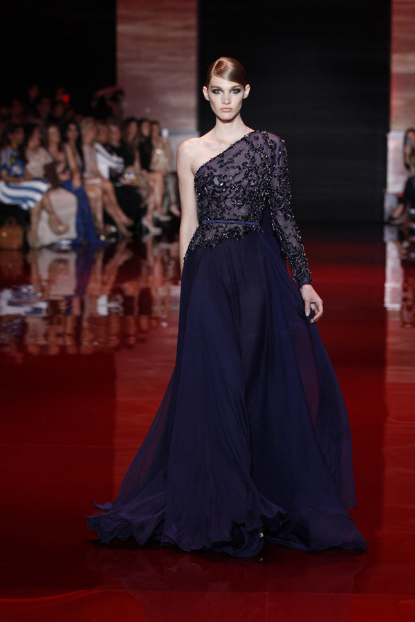 تحوّل قصر Brogniart التاريخي إلى مسرح فخم تألقت على خشبته عارضات أنيقات لتروين حكاية مجموعة Elie Saab الراقية لخريف وشتاء 2013ـ2014. أراد المصمّم من خلال مجموعته الجديدة أن يترجم واقع عرس ملكي في عرض أزياء راق. وقد اتسمت تصاميمه بطابع ملكي وبألوان طغى عليها الأحمر والكحلي والأخضر والفضي فضلاً عن ألوان الياقوت و الزمرد. أما الأقمشة فقد تنوّعت بين الحرير والغيبور والدانتيل والتول والموسلين والساتان فيما أضفى التطريز الدقيق والمنمق المزيد من الجمال والروعة على التصاميم. وقد تميّزت معظم فساتين المجموعة بظهرها المفتوح وكأنّ المصمم أراد من خلال ذلك أن يكشف عن كنز دفين. اختتم العرض بتقديم فستان زفاف مطرّز بخيوط فضية ومرصع بحبيبات من الكريستال. وقد رافقت العروس في إطلالتها ثلاث وصيفات أضفن إثارة وجمالاً إلى هذا العرض الحالم وجعلنه ملكياً بامتياز.