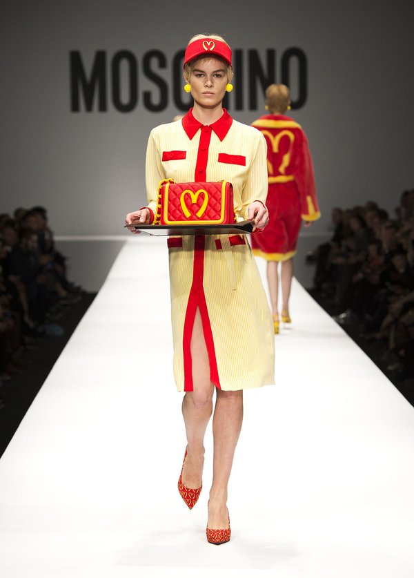 أما دار Moschino الإيطالية، فلطالما عُرفت بقدرتها على دمج روح الدعابة مع الأزياء. ففي عهد المدير الإبداعي Jeremy Scott، حققت الدار قفزات نوعية في مجال الابتكار، وكان عرض خريف وشتاء 2014 بداية لا تُنسى مع تشكيلة مستوحاة من مطاعم الوجبات السريعة والتغليفات التجارية الشهيرة. ومنذ ذلك الحين، واصلت Moschino اللعب على هذا الوتر الإبداعي، مستفيدة من عالم الطعام كمصدر إلهام متجدد يُبرز الإمكانات الفنية غير المحدودة التي تنجم عن دمج الموضة مع عناصر غير متوقعة، تُضفي طابعاً مرحاً ومبتكراً على التصاميم. ويكفي التذكير بفستان البرغر الشهير الذي ارتدته المغنيّة Katy Perry في حفل ما بعد الـ Met Gala عام 2019، والذي جسّد هذا التوجّه بشكل مثالي. وبعده، أطلقت العلامة ضمن مجموعة ريزورت 2022 قطعاً لافتة مثل فستان الهوت دوغ وتنورة البرغر وقبعة البان كيك، في تشكيلة غنية بالألوان والحيوية اجتاحت الإنترنت وأحدثت ضجة واسعة. ثم تابعت الدار مسيرتها من خلال تقديم حقائب على شكل كرفس وخبز باغيت ضمن عرض خريف وشتاء 2024، مؤكدة التزامها المستمر بجعل الطعام أداة تعبير فني مرحة.