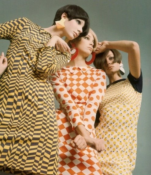 كانت الطبعات الجريئة والمذهلة عنصرًا أساسيًا في أزياء الستينيات. ظهرت على العديد من الملابس ، بما في ذلك التنانير والفساتين والقبعات والجوارب. تضمنت هذه المطبوعات الجريئة والصاخبة تصميمات وخطوط جريئة .