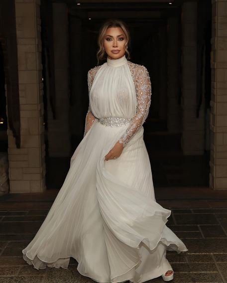 تتميز فساتين نوال الزغبي بالفخامة والأناقة ومن إطلالاتها بالفستان الأبيض ذات الأكمام البراقة استوحي إطلالات في مناسبات يوم العيد.