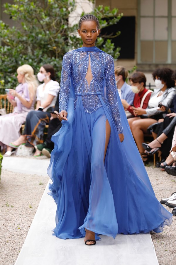 ألوان فساتين السهرة مميزة لهذا العام وتتنوع بين درجات الأزرق والذهبي وحتى الأبيض، ومن مجموعة زهير مراد لموسم 2022 اخترنا لك فستاناً باللون الأزرق مع أكمام مطرزة وفخمة ستجعلك مميزة خلال حضور مناسباتك.