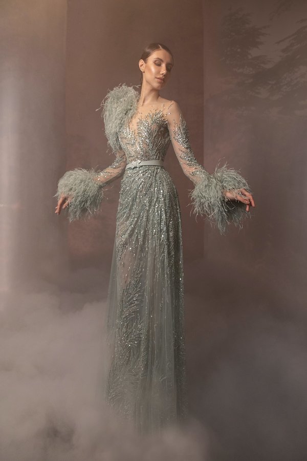 من بين التصاميم المميزة التي ننصحك بها هذا الموسم إن كنت تتمتعين بذوق مميز وفريد هي الفساتين ذات الأكمام الطويلة الشفافة والمطرزة المزينة بالريش.