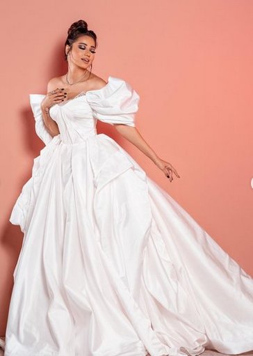 فساتين رحمة رياض باللون الأبيض الرومانسي وبقصة منفوشة ومميزة تليق بجسمها الممشوق.