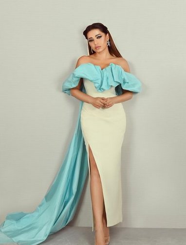 فساتين رحمة رياض بقصات جريئة ومختلفة كلياً وهذا الفستان اختارته من دار آيدن فاشن باللونين الأزرق والبيج.