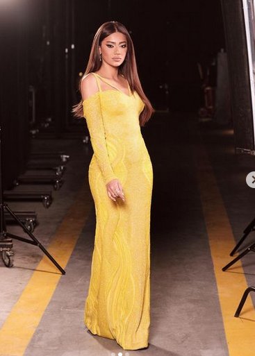 فساتين رحمة رياض باللون الأصفر المميز والجريء ارتدته خلال إحدى حفلاتها في الصيف الحالي يتميز بتصميم أكمامه.