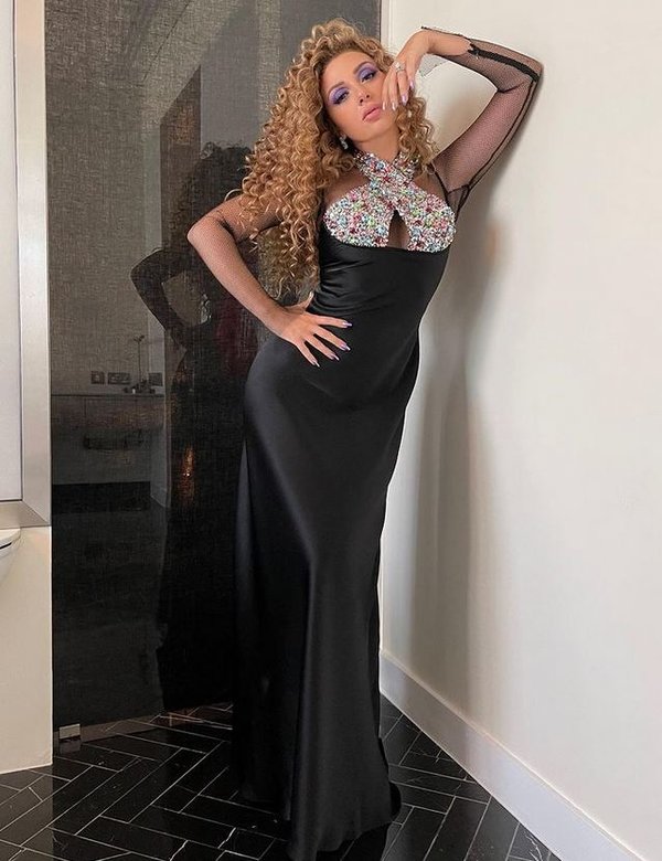 إحدى آخر إطلالة النجمة ميريام فارس كانت بفستان أسود ذات اكمام طويلة من التول الشفاف، وقماش الساتان لتصميم التنورة أما عند منطقة الصدر فقد زين الفستان بأحجار براقة كبيرة أبرزت جمال الفستان وأعطت بريقاً جميلاً للفستان.