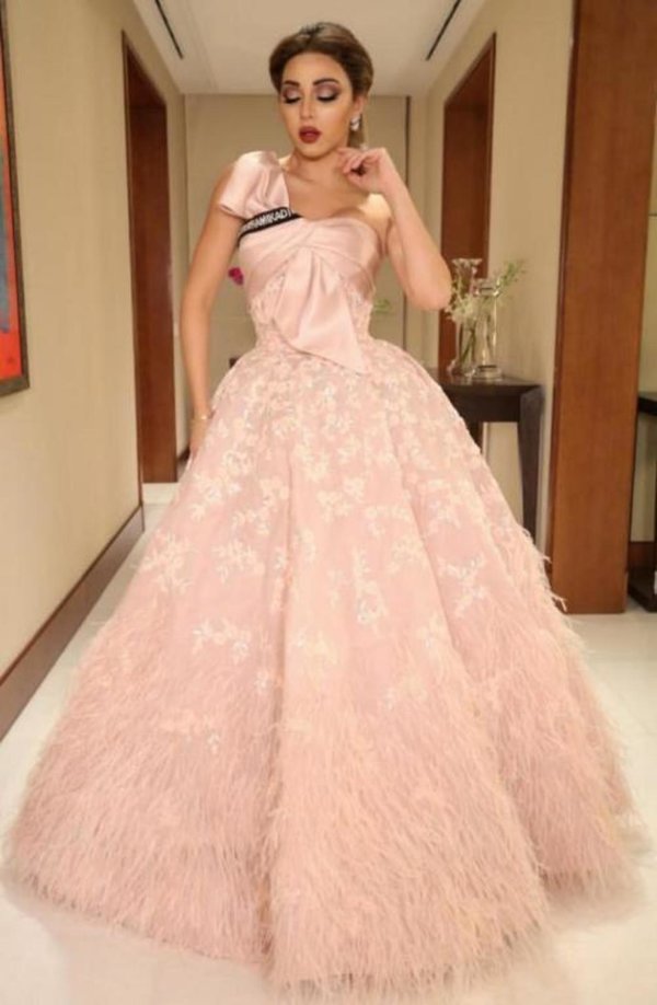 من فساتين ميريام فارس المميزة والأنيقة اخترنا لك موديل فستان مزين بالريش وباللون الزهري، صمم هذا الفستان رامي قاضي وتميز بموديل الكتف الواحد المزين بعقدة الفراشة. هذه الإطلالة تليق بسهرات حفلات الزفاف الفخمة.