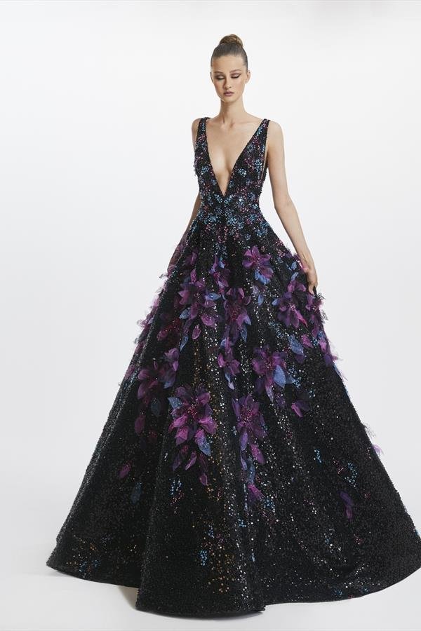 وقع اختيارنا ضمن مجموعة المصمم طوني ورد الأخيرة على فستان منفوش طويل باللونين الأسود والبنفسجي يمكن ارتداؤه خلال مناسبات السنة الجديدة ويليق بالجسم الممشوق والرشيق.