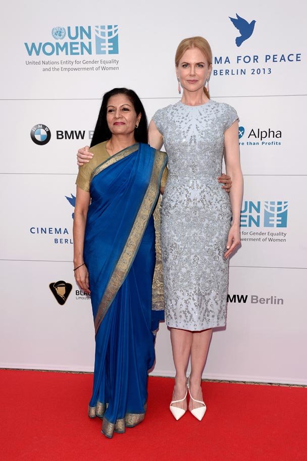 خلال حضورها حفل Cinema For Peace حيث تمّ تكريمها، ارتدت النجمة وسفيرة الأمم المتحدة للنوايا الحسنة Nicole Kidman هذا الثوب المزركش ذا النقشات الناعمة والذي اختارته من مجموعة Elie Saab لربيع وصيف 2013.