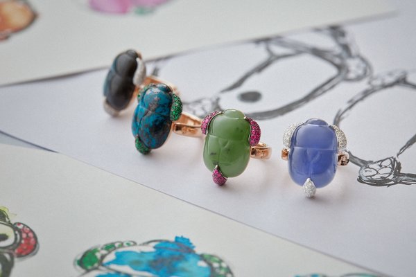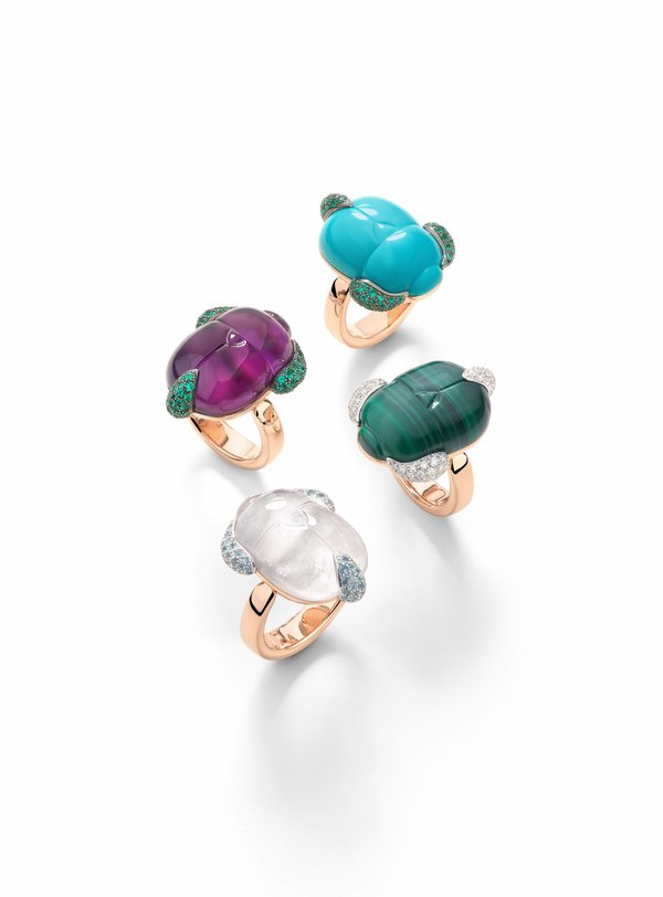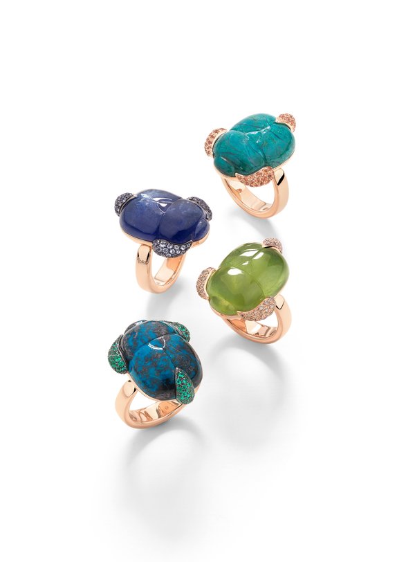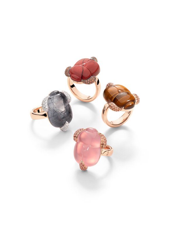 تكرّم هذه المجموعة الجديدة التي تضم خواتم فريدة من نوعها قوة الطبيعة الأم وثروتها المعدنية الرائعة التي تلهم إبداع Pomellato. وتذكرنا الخواتم التي تحاكي شكل خنفساء بخواتم الكوكتيل بأسلوب الكابوشون وبمنحنياتها الناعمة وأحجامها الكبيرة.