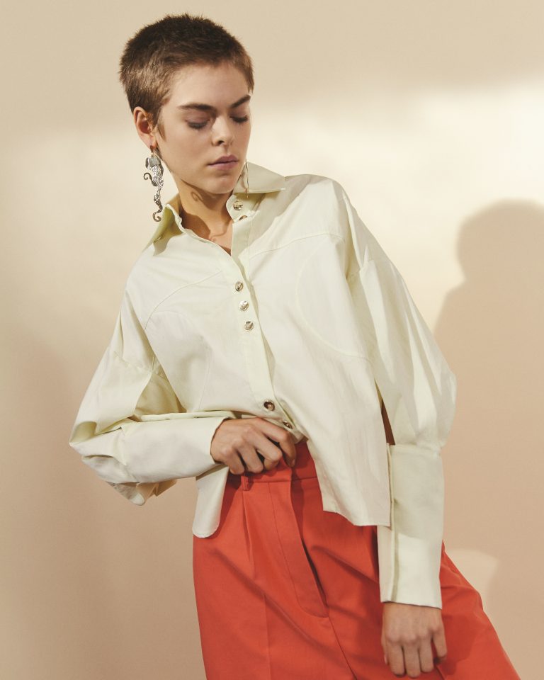 عندما يختار المصمّم القطع التي يريد تصنيعها، يركّز اهتمامه على كلّ واحدة منها على حدّ سواء… ومع ذلك، يفضّل بعض التصاميم على غيرها. ومن مجموعة ربيع وصيف 2019، تشكّل البلوزة الجلديّة البيضاء إحدى القطع المفضّلة لديّ، إذ تتميّز بقصّتها وبحركتها تماماً مثل التصاميم الأخرى في هذه المجموعة الأولى.