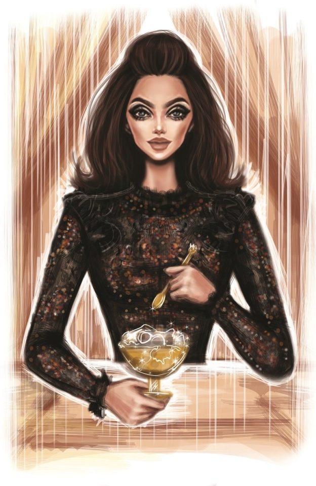 أحسّ الملعقة الأولى رايحة تكون مغامرة مو عاديّة… الثواني تمرّ وأنا أعدّها وأفكّر: معقول آكل الجوهرة الفاخرة ديّة؟ كمان صورة من زاوية مختلفة. صورة الوداع. و… الملعقة الأولى… وأحسّ شارع جميرا وحديقة أمّ سقيم القريبة كلّه يتحوّل لعالم من النكهات. تتذكّرين في أفلام الكرتون القرية اللي بيوتها وأشجارها وكل حاجة بيها مصنوعة من الحلويات؟ أحسّ منطقة المقهى كده. هي الملعقة الأولى بسّ اللي خلّتني أصير مثل أليس في بلاد العجائب. ملعقة ثانية. أريد أحسّ بنكهة كل مكوّن. حاجة فاخرة، فخمة، مو عاديّة… المعلقة الثالثة… أتصوّر إنّه الذهب والمكوّنات رايحين يمشون في خلايا جسمي وشكلي رايح يتحوّل، مثل قصص الخيال… شعر طويل مثل ربانزل وملابس بألوان كثيرة مثل ساندريلا. أنتظر قبل ما آكل الملعقة الرابعة… في الآيس كريم ده لكل ملعقة معنى وقصّة. ومع كل ملعقة تحسّين إنّك تكتشفين نكهة جديدة، سرّ جديد. الملعقة الخامسة… أخوي خسر التحدّي.
