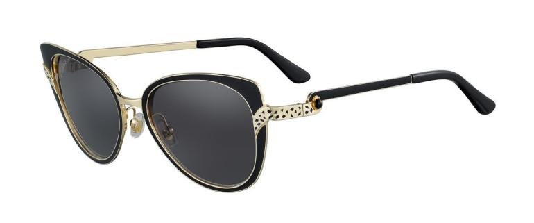تتميز النظارات الشمسية من Panthere Divineمن Cartierبأشكال متنوعة من تصميم يحاكي عيون الهرة، لكر أسود، لمعة بلاتينية، عرق اللؤلؤ المصقول وعدسات رمادية، أو تصميم يحاكي عيون الهرة، لكر أسود، لمعة ذهبية، أونيكس مصقول وعدسات رمادية أوشكل مستطيل، لكر أسود، لمعة ذهبية، أونيكس مصقول وعدسات رمادية أو شكل مستطيل، لكر أسود، لمعة بلاتينية، عرق اللؤلؤ المصقول وعدسات رمادية.