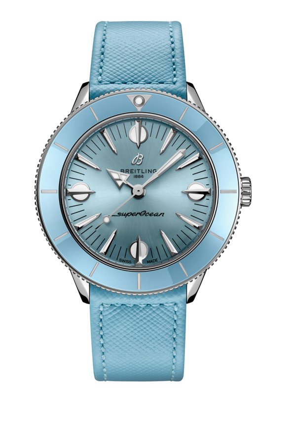 هذا الإصدار من الساعة من مجموعة Superocean Heritage 57 Pastel Paradise، تتميز بلونها الأزرق الفاتح ومقاومة للماء حتى على عمق 100 متر.