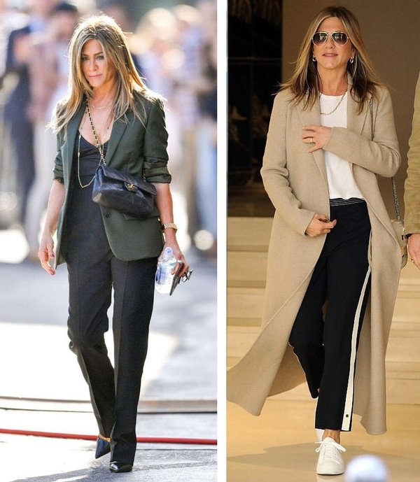 البداية مع جنيفر أينستون التي استنتجنا منها أهميّة السروال واختيار القصّة المناسبة له ومنه. لذلك، إن كنت امرأة خمسينيّة، اختاري دائماً السروال بالقصّة المستقيمة أو الواسعة قليلاً Flared لا سيما إن كنت ترتدين الحذاء الكلاسيكي أو بالكعب العالي. ولكن وإن أردت إطلالة حيويّة، فلا تعتقدي أنّ السراويل الرياضية لا تليق بك إنما يمكنك اختيارها بقصّة مستقيمة وطبعاً ليس الليغينغ أو القصّة الفضفاضة Sweatpant واحرصي أن يكون هذا السروال بلونيّ الأبيض والأسود ونسّقيه مع حذاء رياضي كلاسيكيّ. ولكن ومن أجل إضفاء لمسة عصريّة، استبدلي حقيبة اليد بحقيبة تعتمدينها بأسلوب الـ Cross مع إطلالتك الكلاسيكيّة ونسّقي مع السروال الرياضي معطفاً أو سترة بلايزر وذلك لمزج الأسلوب الكلاسيكي مع الأسلوب الرياضي.