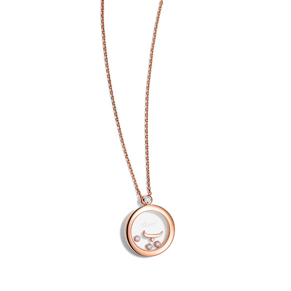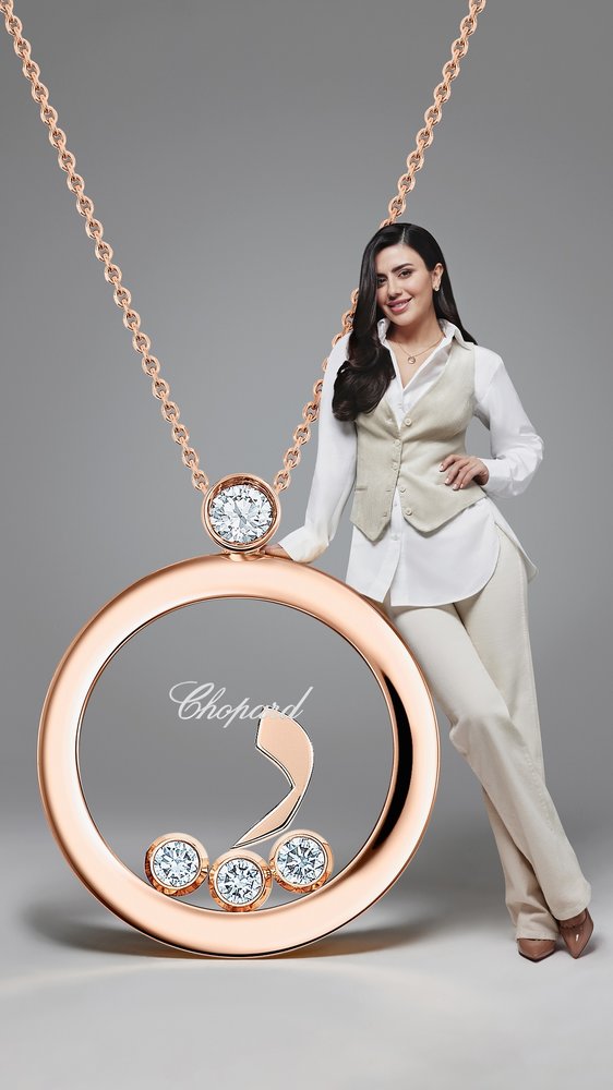 تتمايل الأحرف العربية وترقص فرحًا في قلادات Chopard التي ومن خلال مجموعتها الجديدة Happy Diamonds – Happy Me أعطت للحرف العربي معنى آخر حيث تمايل 15 حرفًا منهم 4 جدد باللون الـ Rose Gold مع قطع من الألماس، تدور حول الأحرف بإنسيابية وخفّة.
