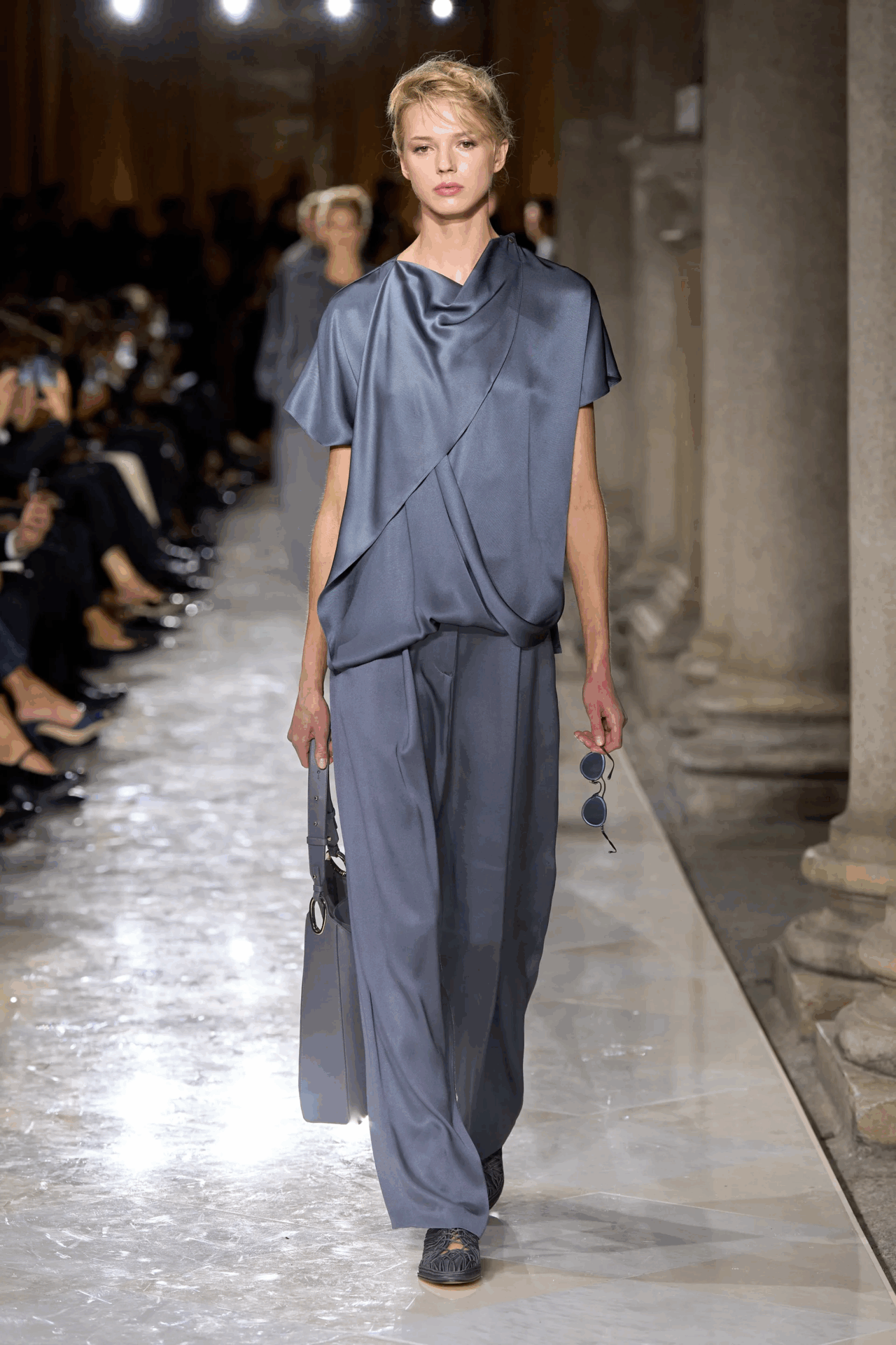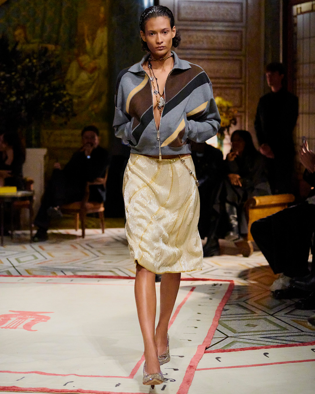 في قلب متحف بيناكوتيكا أمبروزينا، حيث تلتقي الفخامة بالفن، أعادت فيرساتشي Versace إحياء رموزها من أسس الأناقة البورجوازية الإيطالية الى تناقض الكلاسيكية مع حس الموضة العصرية، حيث تداخلت طبقات من الدنيم، الجلد، المعادن والحرير.