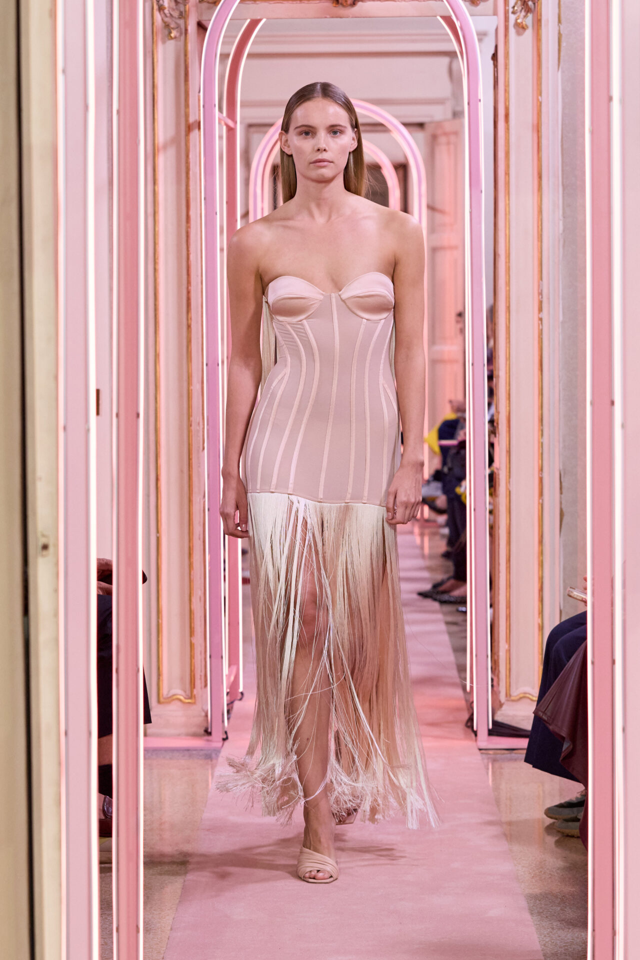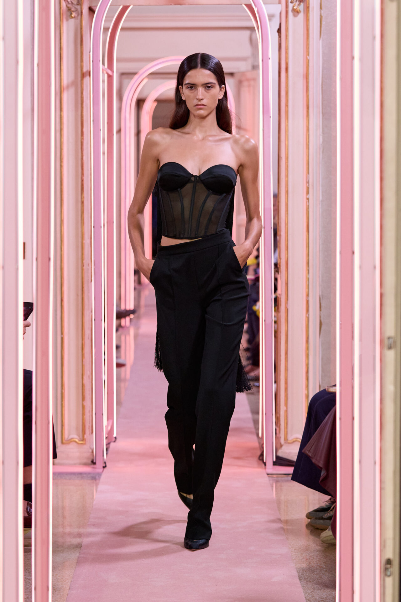 في هذا العرض، تتحوّل أزياء النوم إلى صيحات راقية من خلال قمصان وسراويل من الأقمشة الفاخرة بقصّات ذكورية فضفاضة أو ضيّقة، مزيّنة بتطريزات كريستالية وتفاصيل من الأحجار الصلبة، إلى جانب كورسيهات دانتيل ناعمة تضيف لمسة من الرقة والأنوثة.
