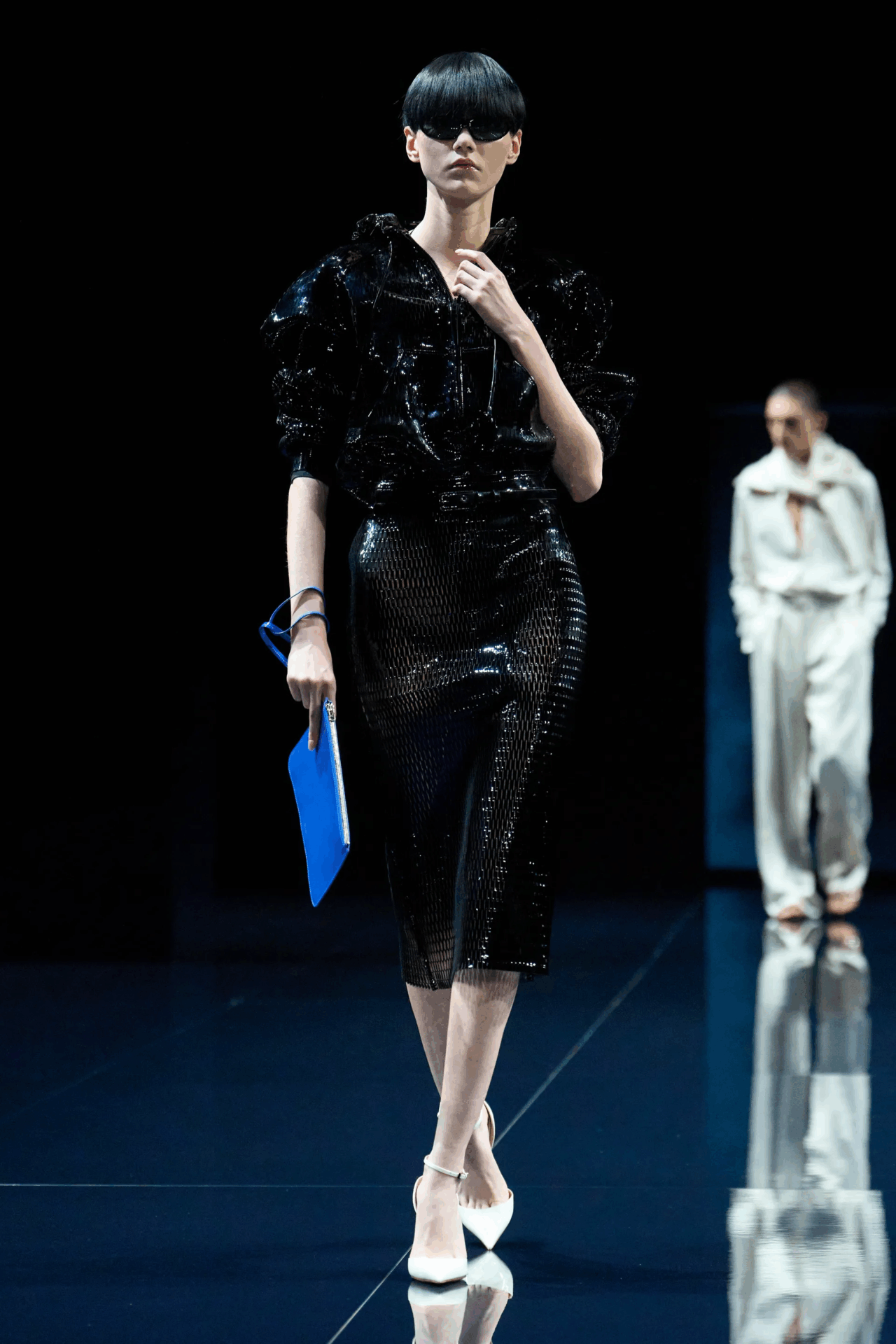 أما الأقمشة، فكانت عنوان الفخامة، إذ سيطر الجلد اللامع بتفاصيله الدقيقة والمزخرفة بفتحات ناعمة لتمنح القطعة إطلالة جريئة دون أن تفقدها أناقتها. كما أضافت بدلات الساتان لمسة من النعومة المترفة، جاءت بألوانٍ نابضة بالحياة مثل الأخضر الليموني، الأزرق السماوي، والأزرق .