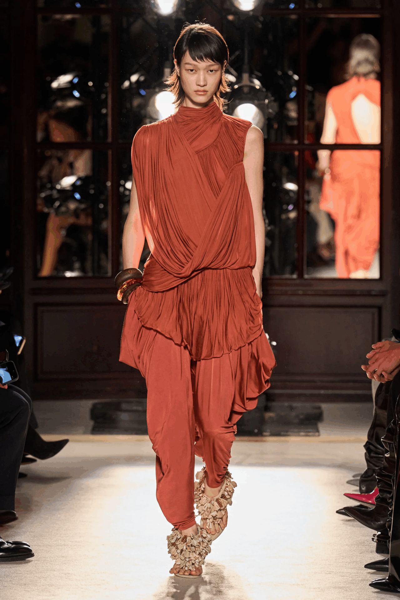 من ناحية Balmain، فتنوّعت باليت الألوان بين الزيتي والبرتقالي مع تصاميم حريرية وستانية فضفاضة ومطويّة بإنسيابية، كشاكش أنيقة، كنزات ناعمة من الكشمير والقطن، وتنانير مزيّنة بالأصداف.