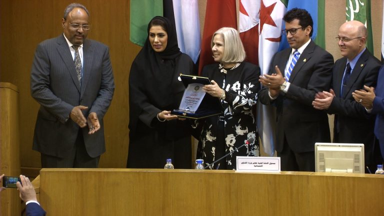 نظراً لجهودها في دعم وتطوير قطاع رياضة المرأة العربية وتعزيز