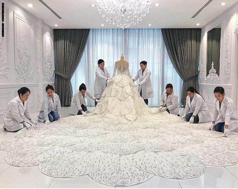 7 أشخاص لحمل فستان زفاف واحد! فمن المصمم وكيف شكله؟
