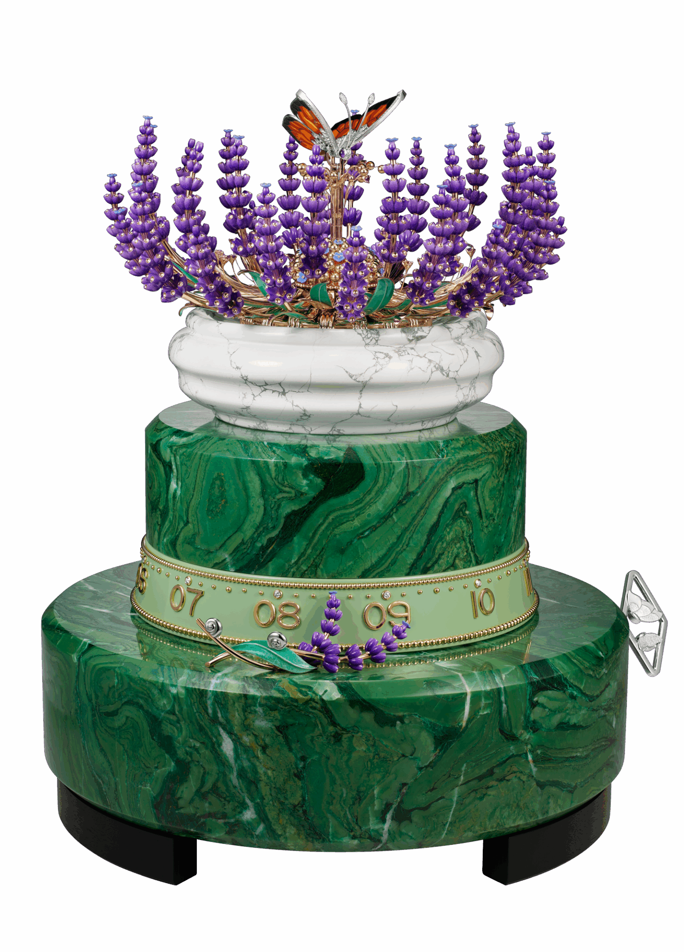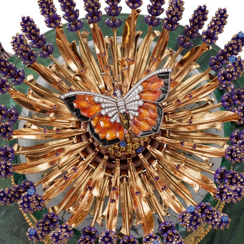 يبلغ ارتفاع الدمية الميكانيكية ما يعادل 30 سنتيمترًاوهي تكشف عن مشهد يخطف الأنفاس ما إن يتمّ تفعيل آليتها الحركية. فيتفتح تويج زهرة الخزامى بصورةٍ تدريجية، كما لو كان يتحرّك بفعل نسمة خفيفة، لتتجلّى فراشة ترفرف بحركة دائرية متمايلة. تبدو أجنحة الفراشة مزدانةً بالمينا البرتقالية بتقنية بليك أجور في تعارضٍ مع أحجار الماس والمينا السوداء المعتمة التي تحدّد أطرافها. أما باقي جسم الفراشة فمصنوع من حجر عين النمر، فيما تتلألأ عيناها بحجرين من الأميتيست بقصة كابوشون. أما قرنا الاستشعار فمزينان بالماس. وتحلّق الفراشة برشاقة فوق عنقود من الحبيبات الذهبية المرصعة بالأميتيست، ثم تعود لتجد ملاذها من جديد في قلب الباقة التي تنغلق حولها برفق.