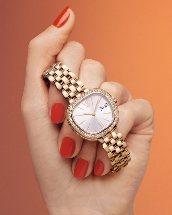 يتميز سوارها المرن بحلقاتٍ منحرفة الشكل ومتداخلة تغلّف البشرة أما الأضلاع المنحوتة برقّة على الإطار، فهي تذكّر بروح ساعة بياجيه الأيقونية من آندي وارهول لتأتي المؤشرات الذهبية والعقارب على شكل أسهمٍ على ميناء ساتاني.