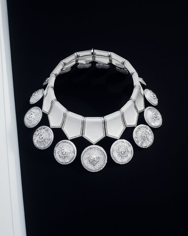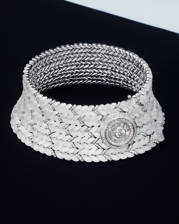 هو عنصر فاخر ورمز شهير في عالم الأزياء الراقية، بأسلوب يتجاوز حدود الزمن. وتُبدع كلير في تقديم هذا التصميم الهندسي، محققة تناغماً فنياً بين نسيج الكريستال الصخري غير اللامع وبريق الألماس. يتألّف تصميم العقد من 435 قطعة من الكريستال الصخري غير اللامع بقطع الباغيت، مقطوعة يدوياً بعناية ومنسّقة داخل إطار من الذهب الأبيض.