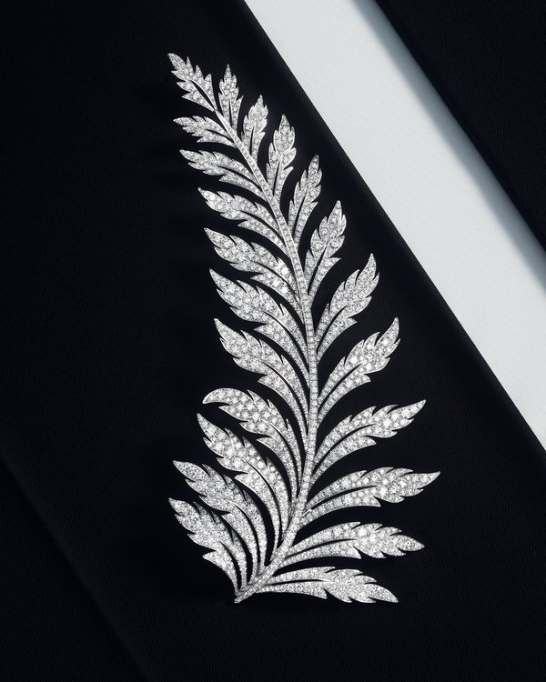 في هذا الإبداع، تظهر التطريزات المستوحاة من الأغصان من الزيّ الاحتفالي بشكل أوراق نبات السرخس، والذي كان فريدريك بوشرون يُكنّ له عشقاً خاصاً. وتبدو هاتان الورقتان المرصّعتان بالألماس بالكامل على إطار من الذهب الأبيض، وكأنما نحتتهما الرياح برقّتها. ويُمكن التزيّن بالورقتين كمشبكين يُضفيان أناقة على الملابس، أو تحويلهما إلى قطعتين فاخرتين لزينة الشعر بفضل نظام تعدّد الاستخدام.