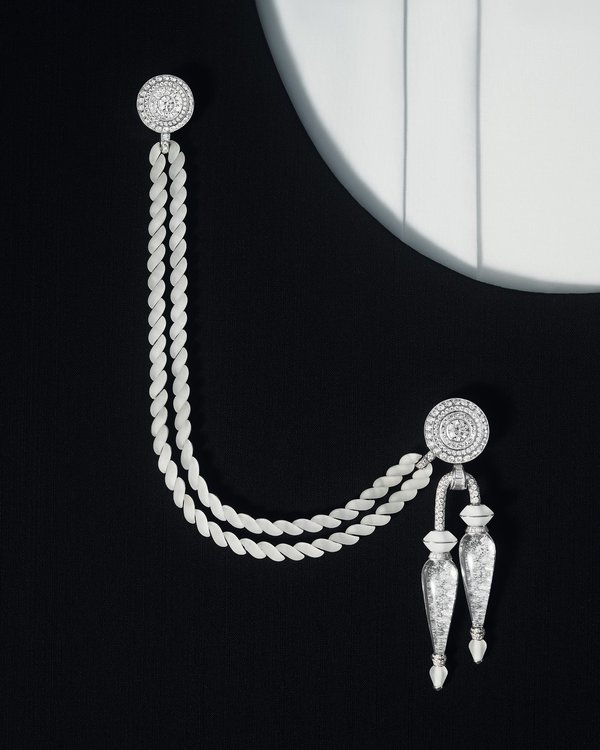 تُعيد دار بوشرون تقديم الحبل المضفّر aiguillette بأسلوب مبتكر، وهو عبارة عن عنصر زخرفي شهير في عالم الأزياء الرسمية. وفي هذا الإصدار الفريد، يأتي الحبل المضفّر على شكل عقد متقن الصنع من الذهب الأبيض، معزّز ببريق الكريستال الصخري والألماس، ويمكن التزيّن به بأساليب متنوّعة. ويستكمل العقد زوج من الأقراط المعلّقة المرصّعة بالكريستال الصخري والماس، يمكن التزيّن بهما بشكل طويل أو قصير.