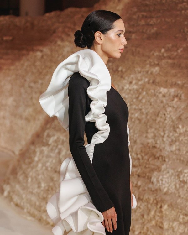 حاولت العلامة DAZLUQ أن تكون مختلفة خلال اسبوع الموضة في الرياض حيث ركزت على اللونين الأسود والأبيض ضمن قصات مميزة، برزت فيها الكشكش ومبدأ الملابس الفضفاضة المريحة.