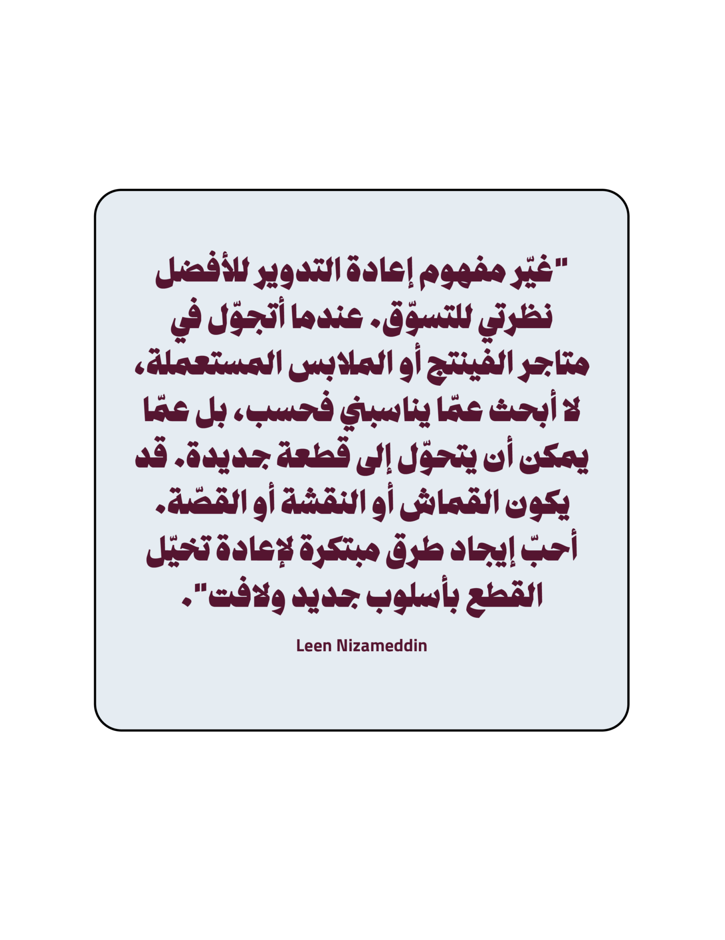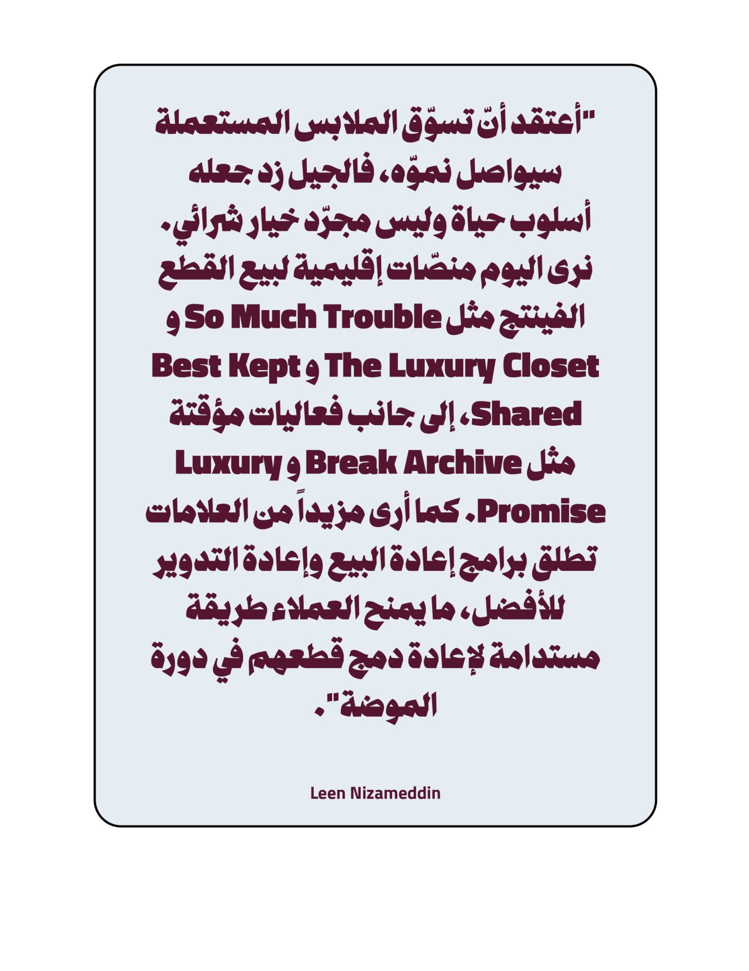 وبالدخول أكثر إلى عالم وسائل التواصل الاجتماعي، تبرز المؤثّرة Leen Nizameddin في الشرق الأوسط كإحدى أبرز عاشقات تسوّق المنتجات المستعمَلة، إذ نشأت في بيئة تُولي الاستدامة اهتماماً كبيراً جعلها جزءاً من أسلوب حياة كامل. وفي مسيرتها نحو تبنّي الاستدامة، تؤمن Leen بقيمة تسوّق الفينتج لما يحمله من أثر بيئي إيجابي، إضافةً إلى إتاحته الفرصة لاقتناء قطع فريدة تُكرّس هوية شخصية لا تخضع لسيطرة الصيحات. وتمنح Leen أهمية بالغة للشفافية عند شراء القطع المستعمَلة، مركّزةً على اختيار المواد مثل القطن العضوي والبوليستر المعاد تدويره والـ Tencel، إضافةً إلى شهادات موثوقة مثل Global Organic Textile Standard و Fair Trade.