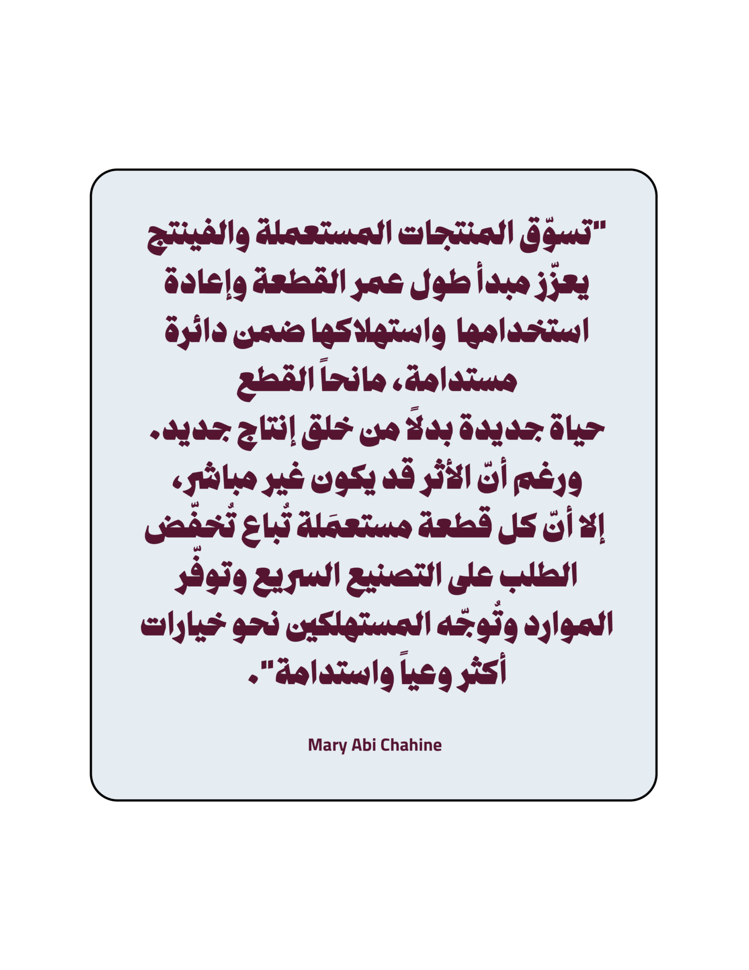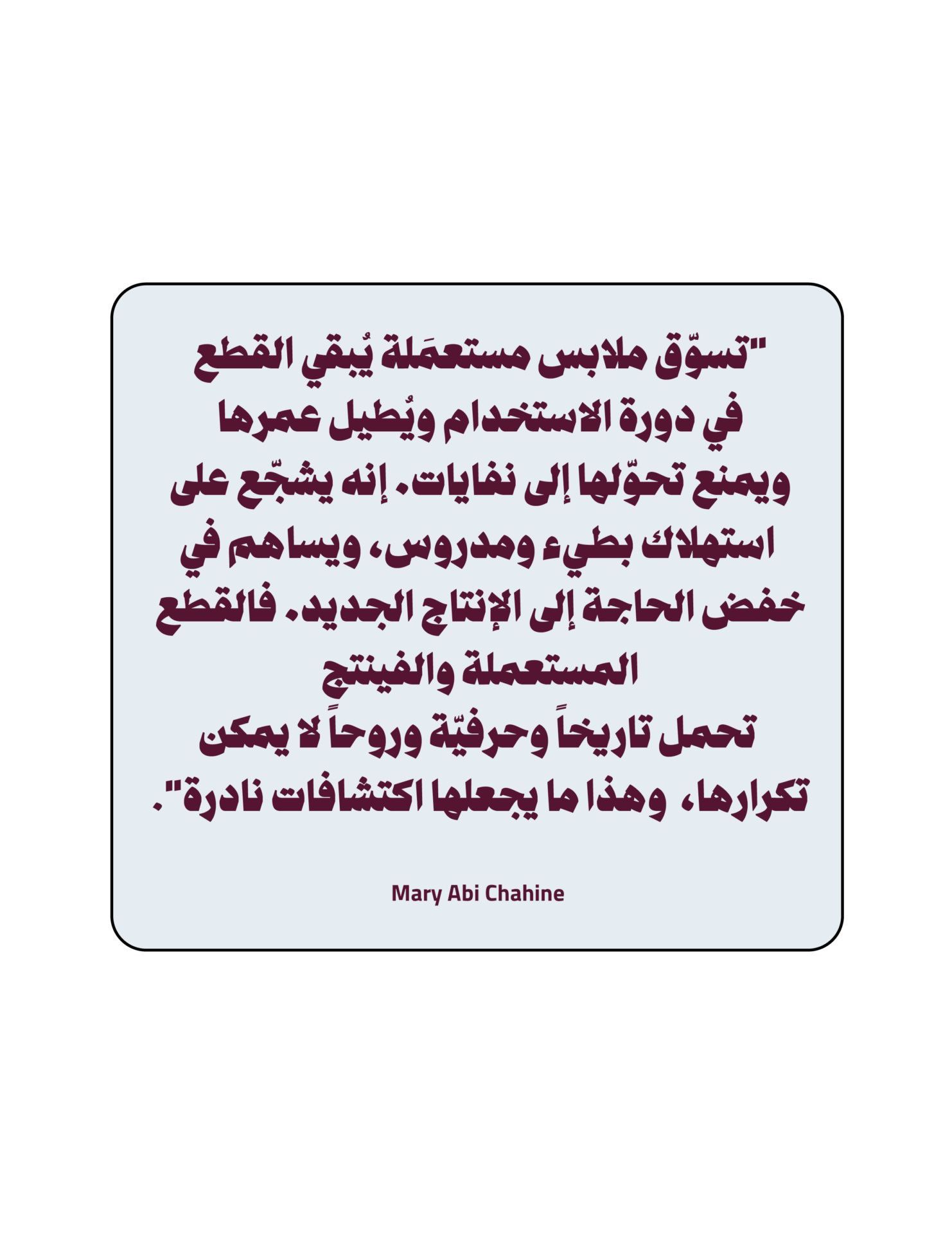 وترى Mary أنّ تعريف المنتج المستدام ينبني على ثلاثة محاور: الاجتماعي والاقتصادي والبيئي، إذ يُساهم كل محور منها في تعزيز جوهر الاستدامة، أي الحفاظ على الموارد وتقديم الأولوية للخلود على حساب الصيحات العابرة، سواء كانت القطعة فينتج أو معاد تصميمها أو مصنوعة من مواد صديقة للبيئة مدعومة بشهادات رسمية تضمن الشفافية والتتبّع.